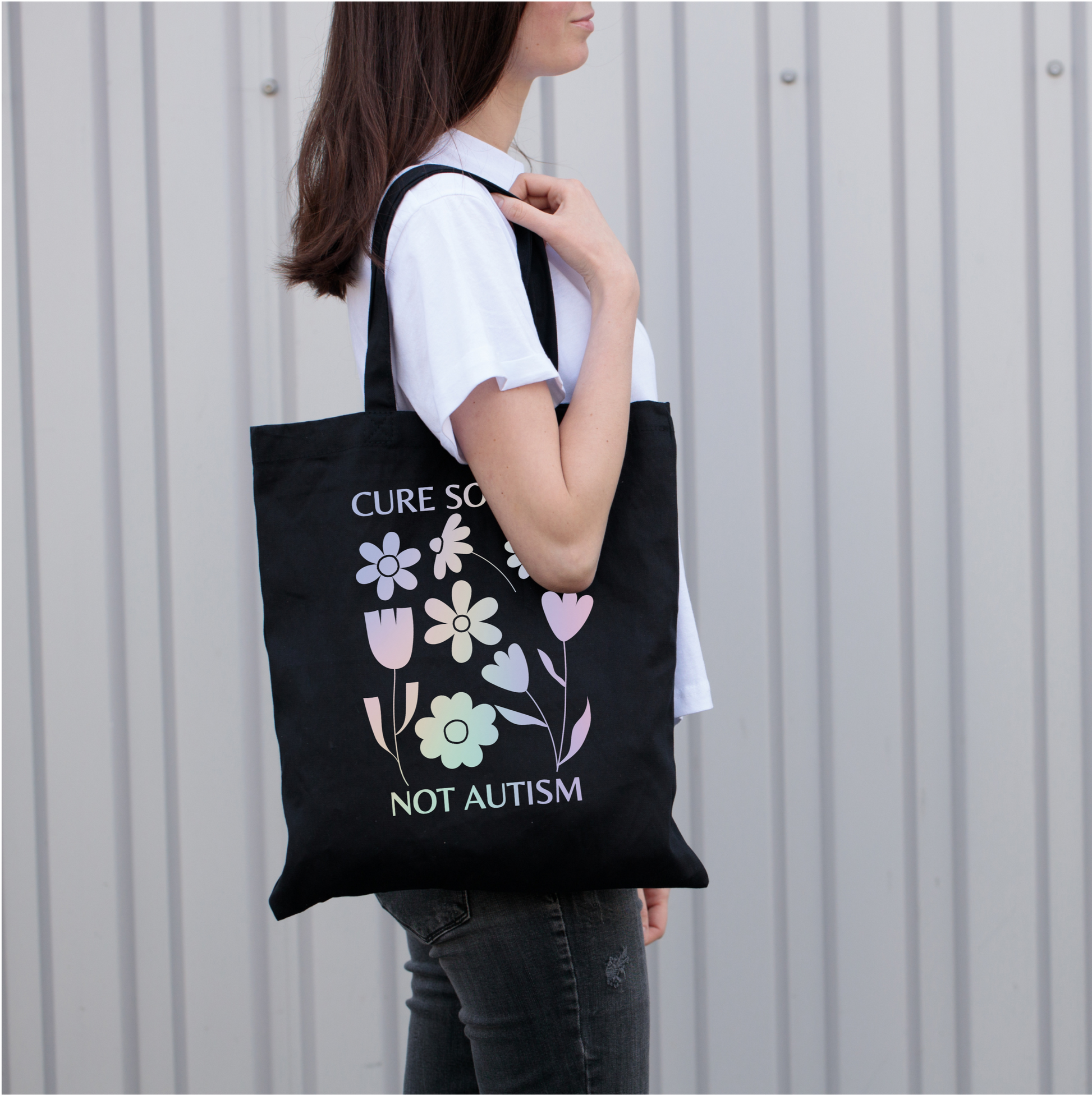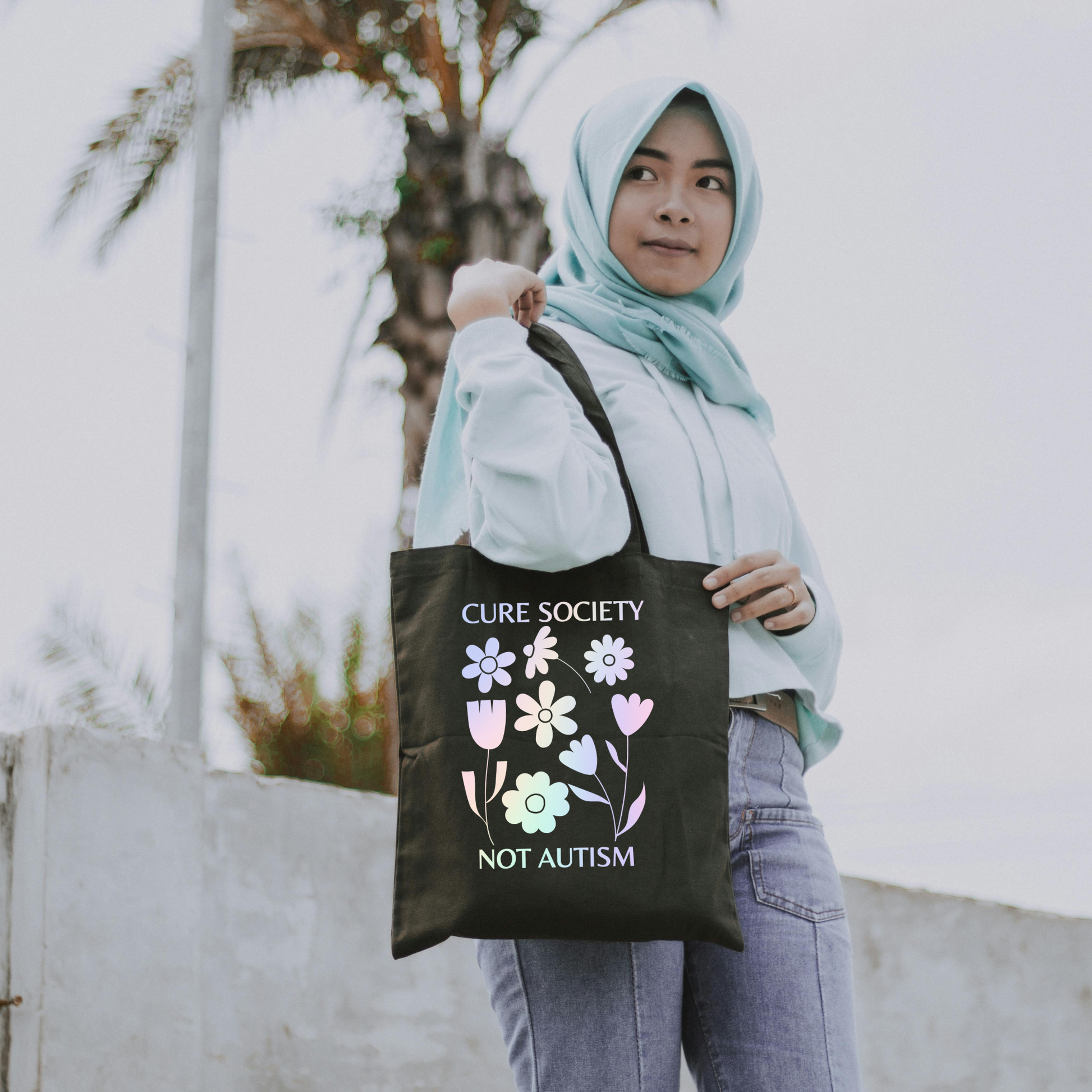 This tote bag with the message "Cure society, not autism" is designed by an actuatlly autistic designer. It embraces autism. not as an illness, but something that can just be. A statement piece for those who want to spread awareness and acceptance. Relevant for Autism Awareness Month, World Autism Awareness Day, and everyday advocacy.
