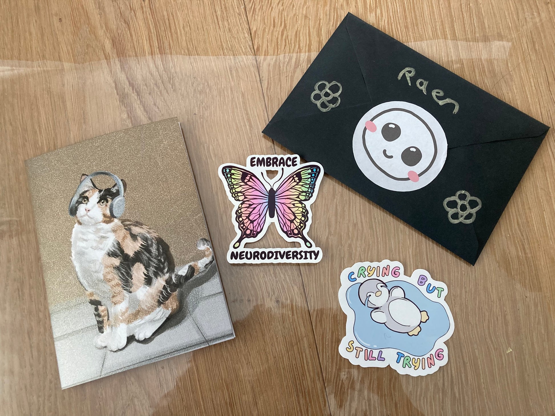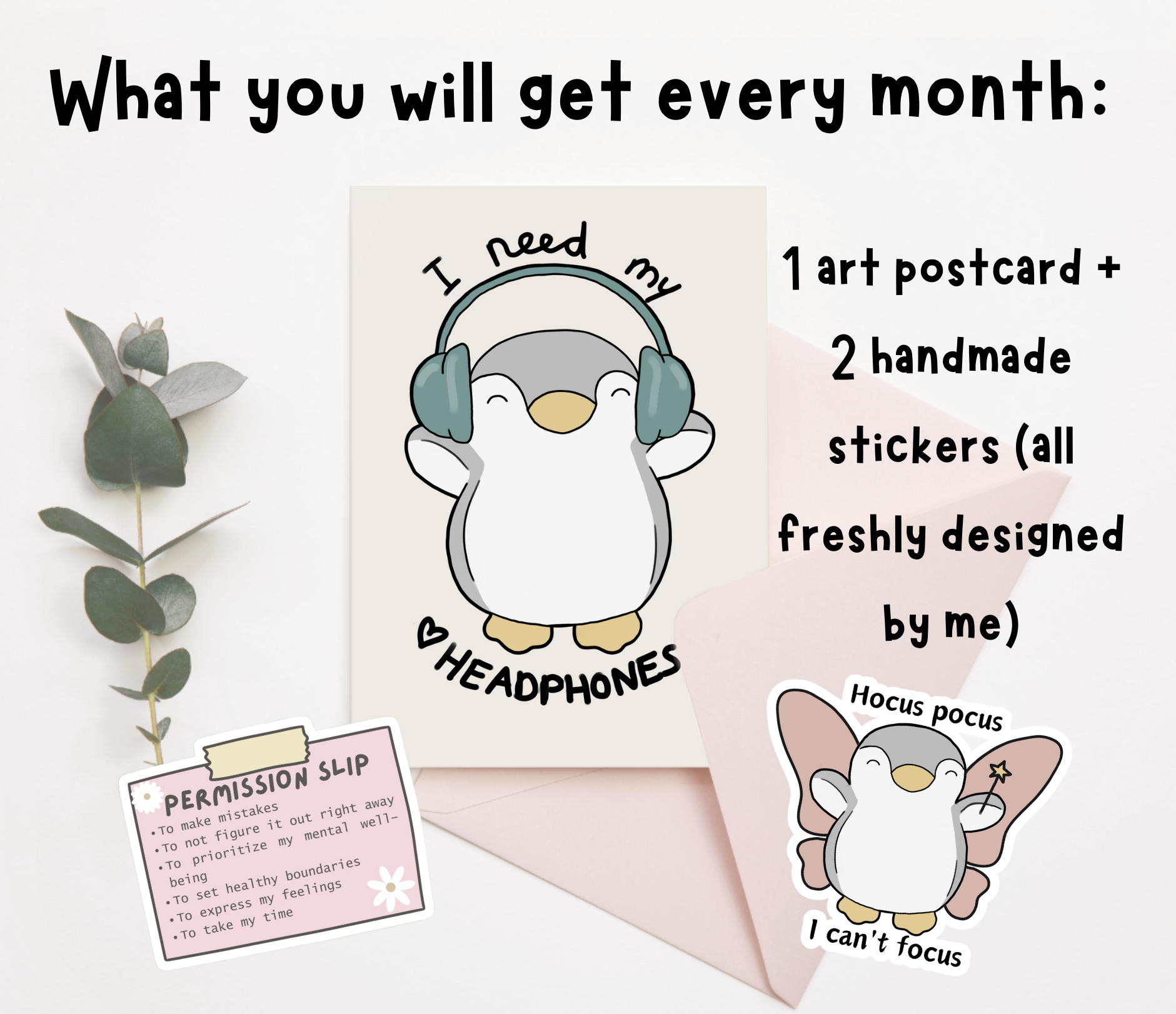 This is a subscription to get one postcard and two stickers (both unseen designs) every month. The designs are a cute artstyle with neurodiversity affirming designs. Delivered on the 10th of every month. The shipping is free.